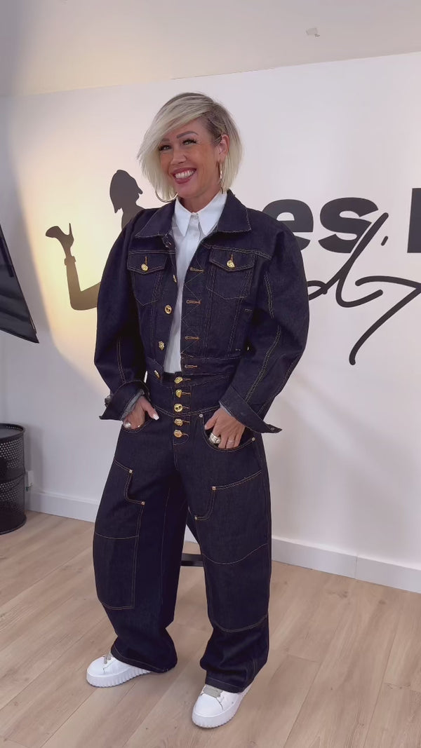 Cet ensemble denim brut très couture revisite le jean avec audace et caractère. Il se distingue par ses boutons couleur or cousus main au design unique.