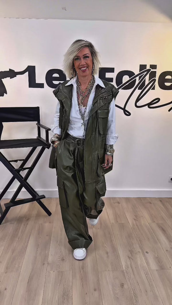 Ce gilet cargo oversize en simili de très belle qualité et doux au toucher incarne parfaitement l’esprit chic et moderne propre à la marque Italienne LUMINA. Sa coupe ample lui donne une allure structurée et contemporaine tout en restant confortable. Ce coloris vert olive est très élégant et tendance cet hiver. Il peut se serrer à la taille grâce à un lacet intérieur, pour ajuster la silhouette selon l’envie. Un modèle unique qui allie style urbain et sophistication, parfait à associer avec le pantalon ELENA pour un total look affirmé.