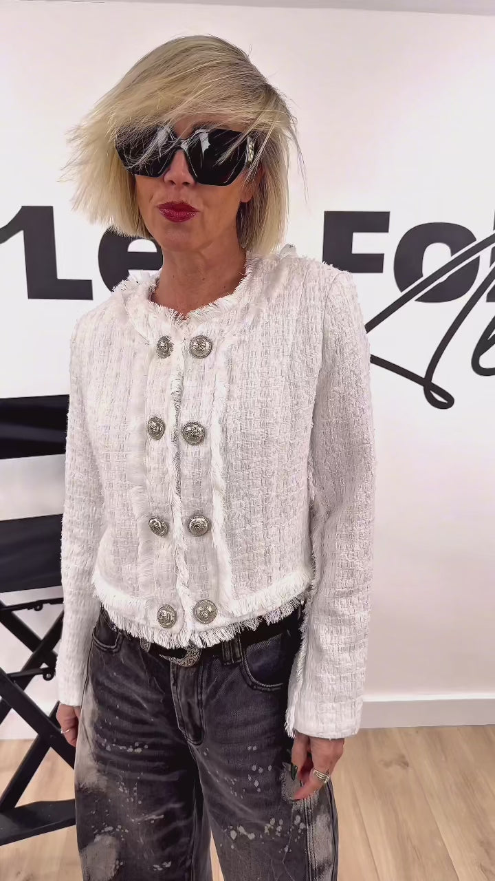 Quelle élégance… La veste GABRIELLE incarne parfaitement le chic intemporel revisité. Confectionnée en tweed blanc lumineux, elle apporte immédiatement une touche raffinée et sophistiquée à ta tenue. Sa coupe courte vient structurer la silhouette tout en gardant une allure féminine et moderne.