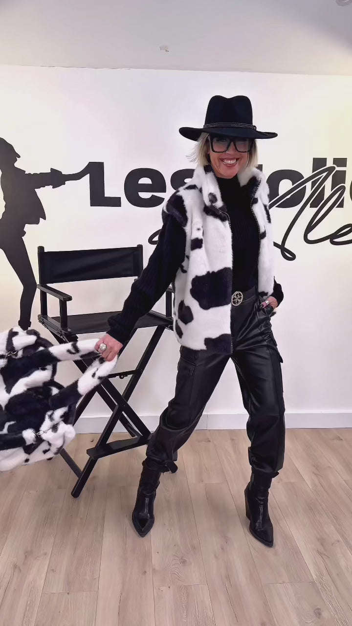 Este chaleco sin mangas ultraoriginal de piel sintética luce un estampado de vaca en blanco y negro. Increíblemente suave al tacto, es divertido y moderno. Se cierra con una cremallera dorada en la parte delantera para un toque chic. Su cuello alto enmarca el cuello a la perfección y realza su tacto acogedor.