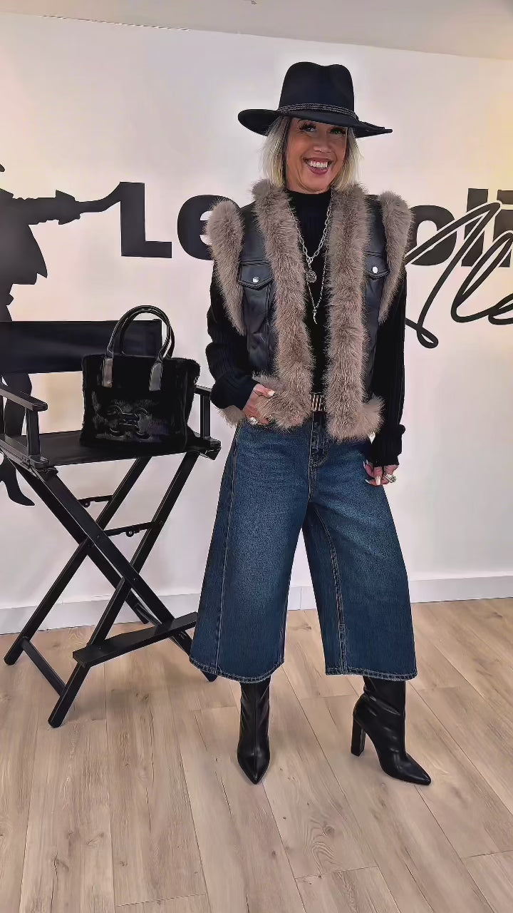Fabricada en suave piel sintética negra, está rematada con pelo sintético beige para un tacto suave y elegante, y forrada con forro polar. Los dos pequeños bolsillos con solapa en la parte delantera son un detalle práctico y elegante. Este diseño sin mangas es fácil de llevar sobre una camisa, un vestido o un suéter fino.