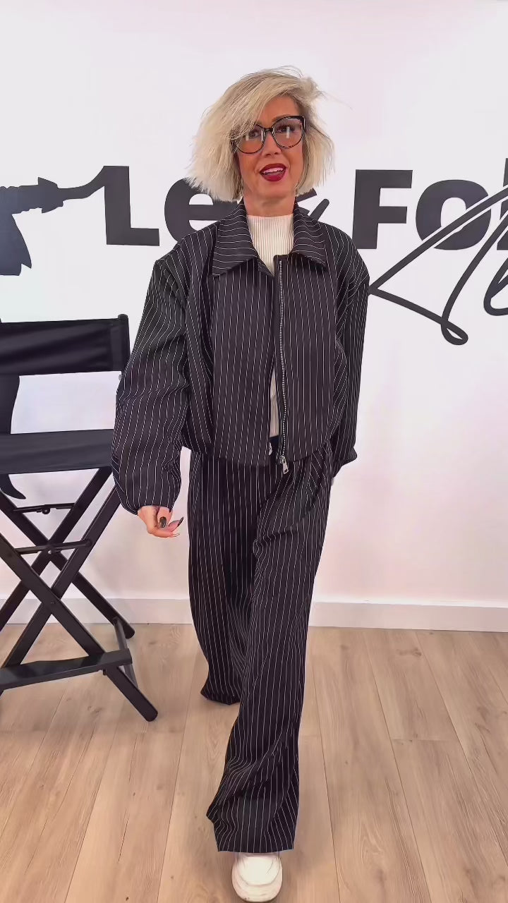 Si tu aimes les ensembles qui sortent des sentiers battus, celui-ci est un vrai coup de cœur. Avec ses rayures sophistiquées, il revisite complètement l’esprit du tailleur classique pour proposer une silhouette chic, moderne et décontractée à la fois. C’est l’ensemble parfait quand tu veux être élégante sans tomber dans le côté trop strict d’un costume traditionnel.