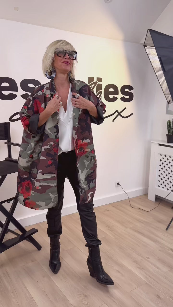 La Parka TRENDY revisite le style camouflage avec une touche inattendue et ultra mode : de grandes roses rouges imprimées qui apportent originalité et contraste. Avec son coupé 3/4 oversize, elle offre confort et allure streetwear. Son tissu imperméable est idéal pour affronter la saison avec style. Elle est dotée de poches latérales.