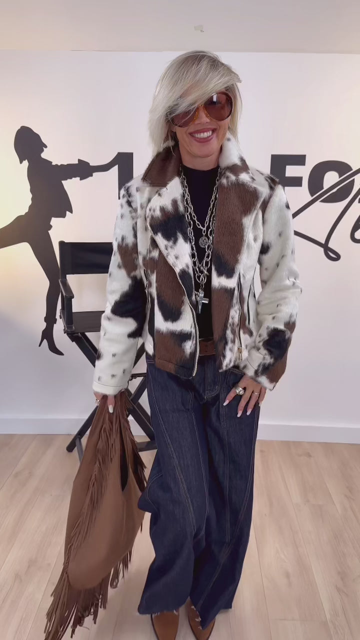 Cette veste coupe perfecto revisitée ose l'originalité avec son poil ras imprimé vache très tendance cet hiver. C'est un article dessiné par la marque « MOTEL » , une marque premium qui conçoit des pièces de qualité. La silhouette iconique du perfecto se mêle à une matière texturée inédite qui habille les regards. Les fermetures zippées sont dorées et donnent un contraste chic et lumineux. Elle est dotée de poches latérales zippées dorées également.