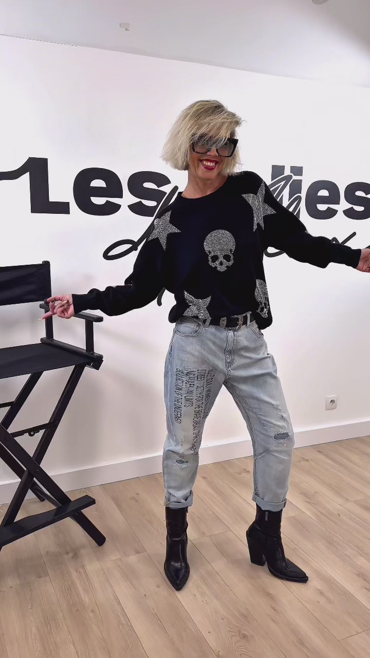 Sa matière stretch est ultra agréable à porter et épouse la silhouette tout en douceur. Les motifs d’étoiles et de têtes de mort en strass apportent une touche scintillante et affirmée, pile dans l’esprit rock qu’on aime tant. Il capte la lumière juste ce qu’il faut et transforme un look simple en tenue ultra stylée.