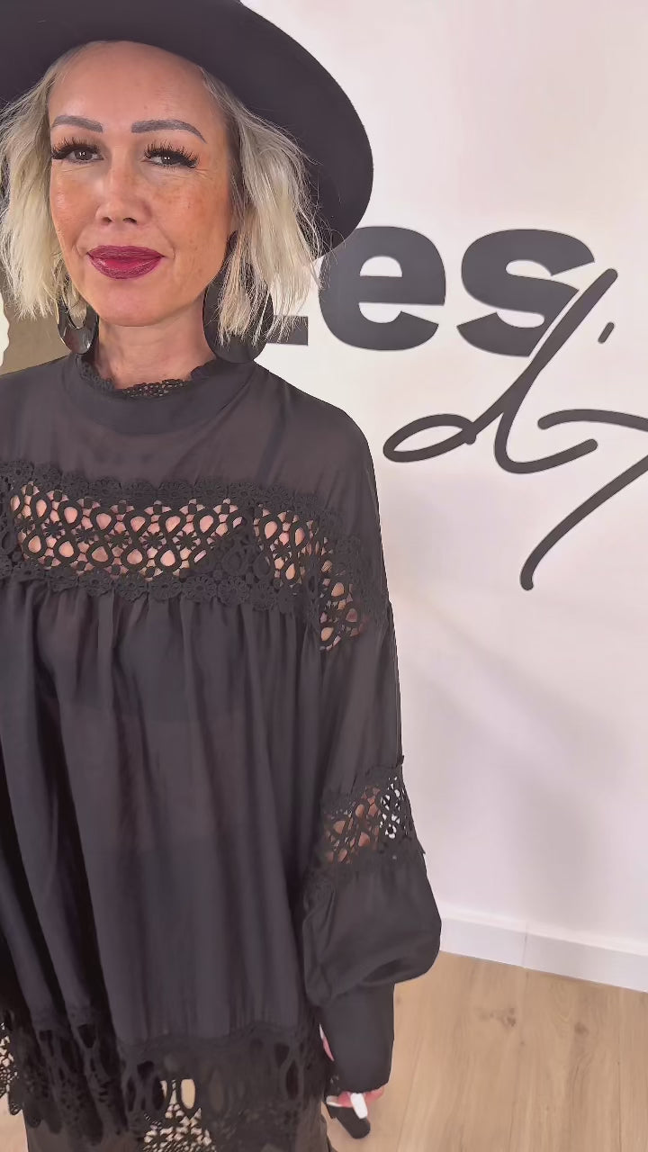 Sa matière est en voile épais de parsemé de dentelle sur la poitrine, les manches et le bas créant un jeu de transparence raffiné. Son col haut sophistiqué apporte une touche de chic et d'élégance intemporelle. Il se ferme grâce à un petit bouton au dos.
